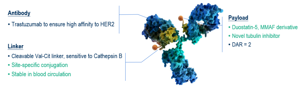 从作用机制来看,A166是一种定点偶联ADC,每个抗体可连接两个药物分子,药物抗体比(DAR)为2。其独特的连接子—valine–citrulline linker,可在肿瘤细胞高表达的组织蛋白酶B作用下特异性裂解,实现药物在细胞内的精准释放。这一设计不仅增强了靶向杀伤能力,也使A166在作用机制上区别于传统ADC,为ADC后再ADC的治疗策略提供了新的可能。