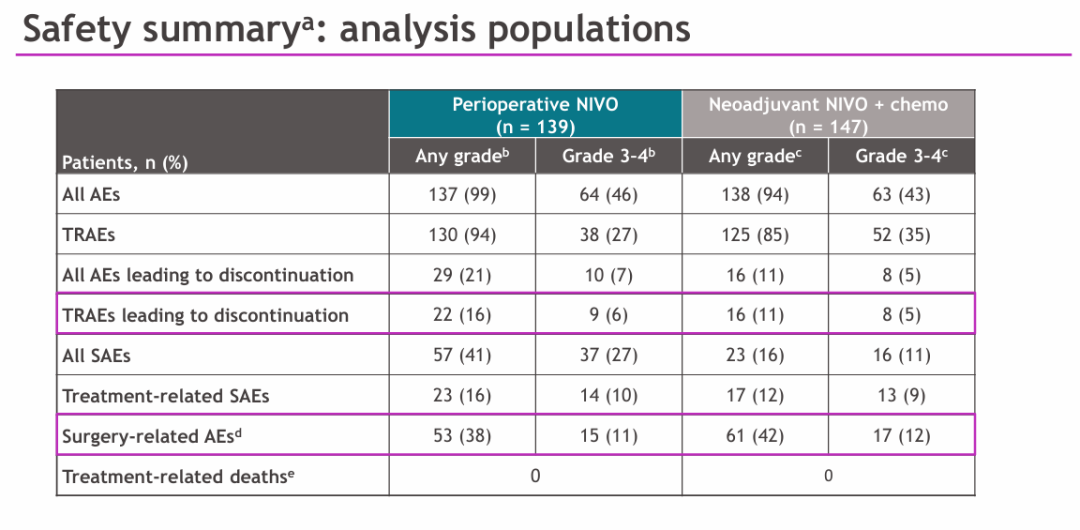 围手术期纳武利尤单抗的安全性总体上是可控的,没有出现新的安全信号。围手术期治疗组中16%的患者发生了导致停药的全级别治疗相关不良事件(TRAE),而新辅助治疗组中这一比例为11%。此外,手术相关不良事件发生率分别为38%和42%。