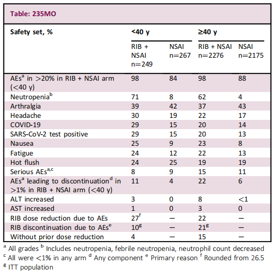 RIB+NSAI辅助治疗在HR+/HER2-EBC患者中显示出治疗获益,包括在疾病更具侵袭性的年龄<40岁的患者中。尽管不同年龄组的安全性特征一致,但年龄<40岁的患者因AE而停药的可能性较低,且未经剂量减少而直接停药的可能性也较低。