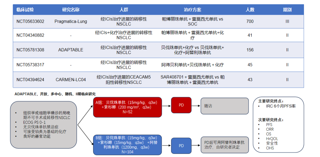 MORPHEUS-Lung研究:旨在探索阿替利珠单抗和贝伐珠单抗±放疗对比多西他赛治疗检查点抑制剂经治的转移性NSCLC疗效及安全性。结果提示了阿替利珠单抗联合贝伐珠单抗或可成为CPI经治的mNSCLC患者的潜在治疗选择。