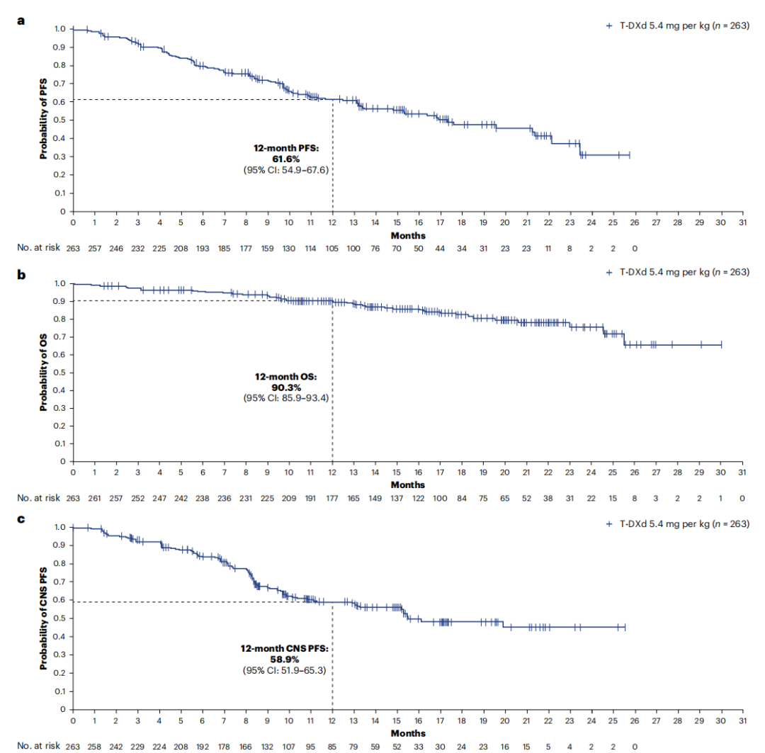 DESTINY-Breast12研究中,总体CNS ORR率为71.7%,在稳定和活动性脑转移患者中分别为79.2%和62.3%。在活动性脑转移亚组中,未经治疗的脑转移患者的CNS ORR为82.6%,而在既往接受过治疗/进展的脑转移患者中为50.0%。在DESTINY-Breast12研究中,尽管随访时间相对较短(15.4个月),但基线脑转移患者的缓解持续持久。有软脑膜转移的患者在DESTINY-Breast12研究中被排除,然而,在两项针对mBC和LM患者的小型回顾性研究中,T-DXd显示出持续的活性:ROSET-BM(n=19)和一项小型病例系列研究(n=8)[3,9]。需要进一步研究来证实T-DXd在这些患者中的疗效。