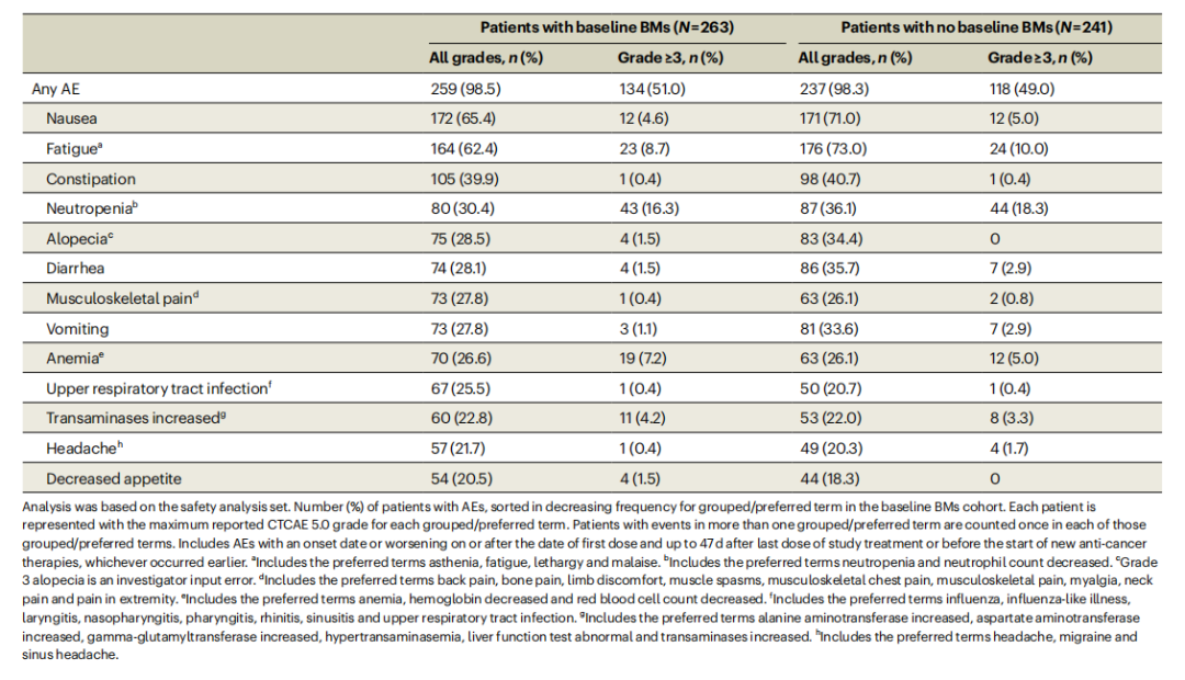 基线脑转移队列:中位总治疗时间为11.5个月(范围,0.1-26.9);最常见的不良事件包括恶心、疲劳和便秘(表2)。134例(51.0%)患者发生≥3级不良事件(AEs),最常见的是中性粒细胞减少(16.3%)、疲劳(8.7%)和贫血(7.2%)。导致停药的最常见AE为间质性肺疾病(ILD)/肺炎(27例,10.3%)。42例(16.0%)基线时脑转移患者报告了ILD/肺炎,大多数事件为1级[n=26(9.9%)]。至首次发生ILD/肺炎的中位时间为168.0天(范围,35-646天)。
