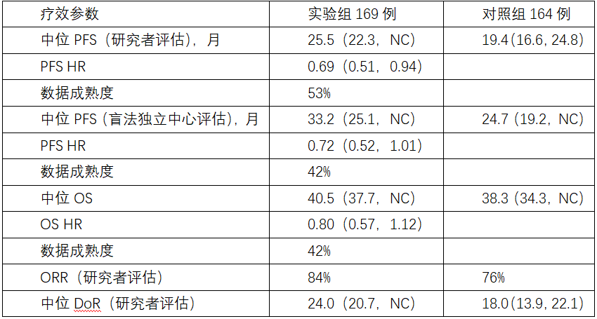 亚洲队列实验组169例,对照组164例,两组的基线特征分别为:中位年龄61岁/61岁,女性受试者占比62%/57%,19del占比53%/61%,L858R占比46%/38%,中枢神经系统转移占比47%/42%,中位基线肿瘤负荷52mm/50mm。