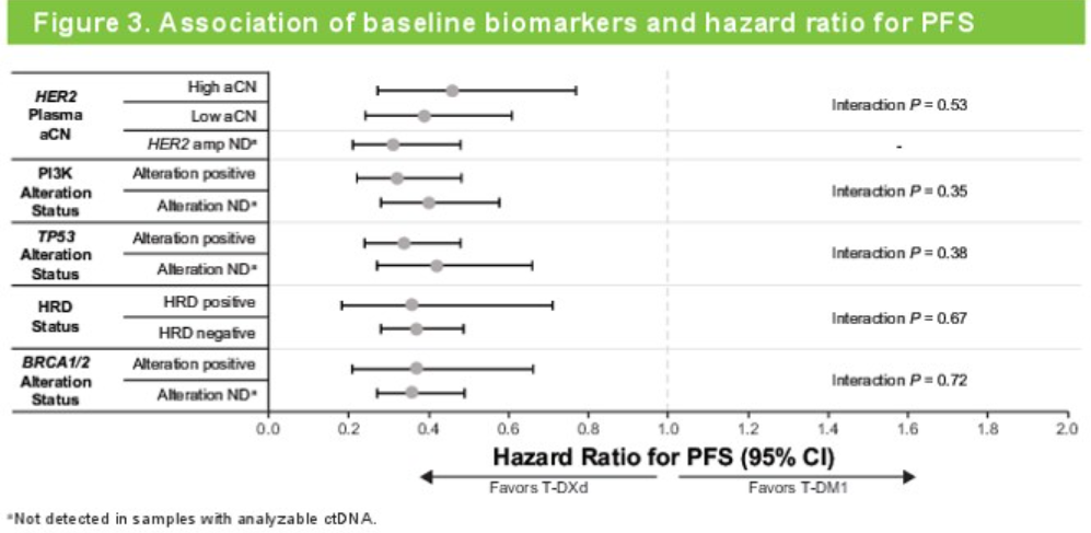 此次SBACS中公布的亚组分析发现,虽然部分基因改变对T-DXd有数值上的影响,但无论HER2阳性患者基线基因突变状况如何,目前均未发现其与T-DXd疗效的显著的影响因素,T-DXd较T-DM1在各基因突变下均保持了疗效优势。目前看来,PI3K突变中,T-DXd的抗肿瘤活性最强,HRD阳性及BRCA突变则具有潜在影响,在这方面仍待进一步的验证。