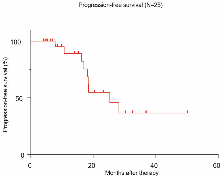 研究共入组25例患者,结果显示,在25例接受治疗的患者中,有11例(44.0%)患者的癌栓降级,中位癌栓高度降低2.3cm。21例患者顺利完成了手术,其中13例患者的手术策略因癌栓高度的降低而得到了调整,手术决策改变比为61.9%(13/21),简化了手术过程。在随访过程中,研究者观察到1年无进展生存率高达89.1%,展示了新辅助治疗在改善患者短期预后方面的潜力;部分患者的2年PFS结果并未达到理想预期,可能与患者初始疾病分期较高有关。这些结果提示,对于II级以上的癌栓患者,术前新辅助治疗可作为一种降低癌栓高度、优化手术条件的策略。