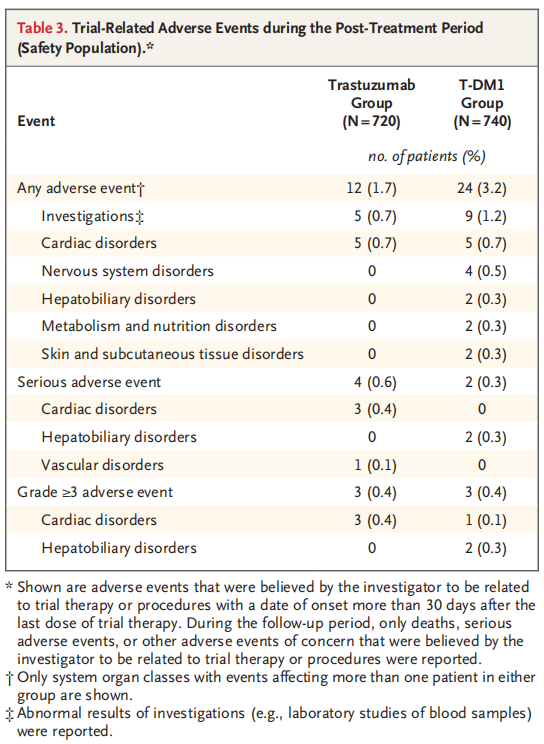 首次数据截止日期(2018年7月25日)和最新数据截止日期报告的总体不良事件在发生率和严重程度方面相似。在整个试验期间,T-DM1组740例患者中有193例(26.1%)观察到3级或以上不良事件,曲妥珠单抗组720例患者中有113例(15.7%)观察到此类事件;两组中分别有94例患者(12.7%)和58例患者(8.1%)观察到严重不良事件。对治疗期间或者治疗后研究者认为与治疗或操作相关的不良事件所做的分析表明,心脏毒性和其他毒性作用在两组中均罕见(表3)。