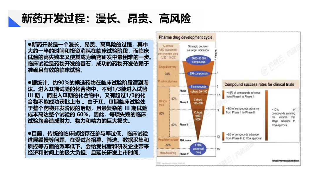 临床试验阶段所消耗的时间与投资成本约占总成本一半,其中Ⅲ期试验占总试验的60%。然而,候选药物在此阶段的淘汰率惊人:约90%止步于临床试验,仅不足10%最终获批。每项失败试验不仅意味着数十亿美元的损失,更导致资源错配,加剧药企的财务压力。