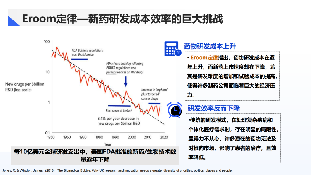Eroom定律——即药物研发成本逐年攀升,而新药产出效率却持续下降。自20世纪50年代以来,每10亿美元研发投入所获批的新药数量以年均8.4%的速度递减,这一定律反映了制药行业面临的巨大挑战。