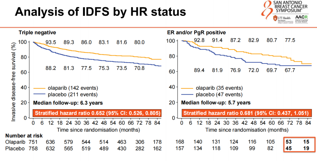 对于三阴性乳腺癌患者,入组条件相对宽泛。如果患者存在胚系BRCA 1/2突变,同时淋巴结阳性或肿瘤>2cm,即可认为其符合入组条件。另外,新辅助治疗之后且non-pCR的三阴性乳腺癌患者也符合条件。