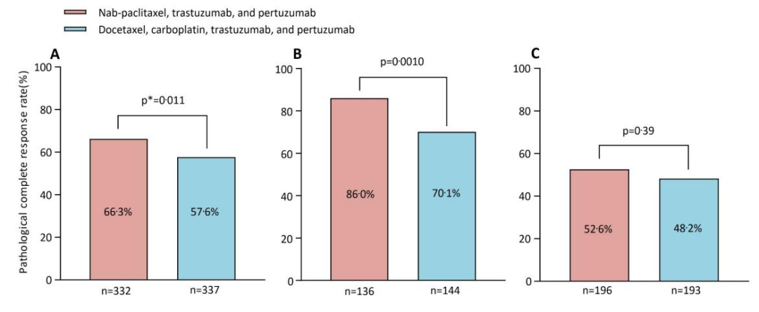 HELEN-006是河南省肿瘤医院刘真真教授团队开展的首个对比白蛋白结合型紫杉醇联合HP(nab-PHP)与多西他赛和卡铂联合HP(TCbHP)在HER2阳性乳腺癌新辅助治疗中疗效和安全性的临床研究。2020年9月至2023年3月期间,689例患者被随机分配到白蛋白结合型紫杉醇组(343例)和多西他赛联合卡铂组(346例)。主要终点为:pCR率,次要终点包括:毒副反应、DFS、OS等。研究结果显示,白蛋白结合型紫杉醇组中有66.3%(220例)的患者获得pCR,而TCbHP组中有57.6%的(194例)患者获得pCR。pCR的OR为1.54(95%CI:1.10~2.14),白蛋白结合型紫杉醇组的pCR率显著高于TCbHP(分层p=0.011)。安全性方面,白蛋白紫杉醇组与TCHP组比较:3-4级血液学毒性类似,消化道症状明显降低,神经毒性明显增高(13%)。