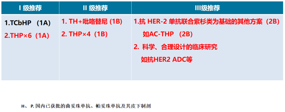 3、基于TCHP、THP等方案证据级别的提高及专家共识度的调整:原抗HER2联合紫衫的其他方案和科学合理的临床研究从II级推荐调整为III级推荐