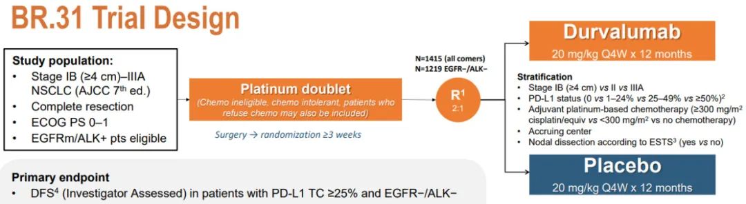 Dr.Westeel:我在2025 ELCC汇报了由十个国际学术组织共同开展的BR.31试验结果。BR.31研究比较了完全切除的IB-IIIA期非小细胞肺癌患者接受一年度伐利尤单抗辅助治疗与安慰剂的疗效。试验主要结果已在去年ESMO大会上公布,而我此次展示的是疾病复发率、第二原发癌发生率及后续治疗情况。需要说明的是,去年ESMO公布的BR.31试验无病生存期(DFS)数据显示,无论PD-L1表达如何,两组间DFS均无差异。