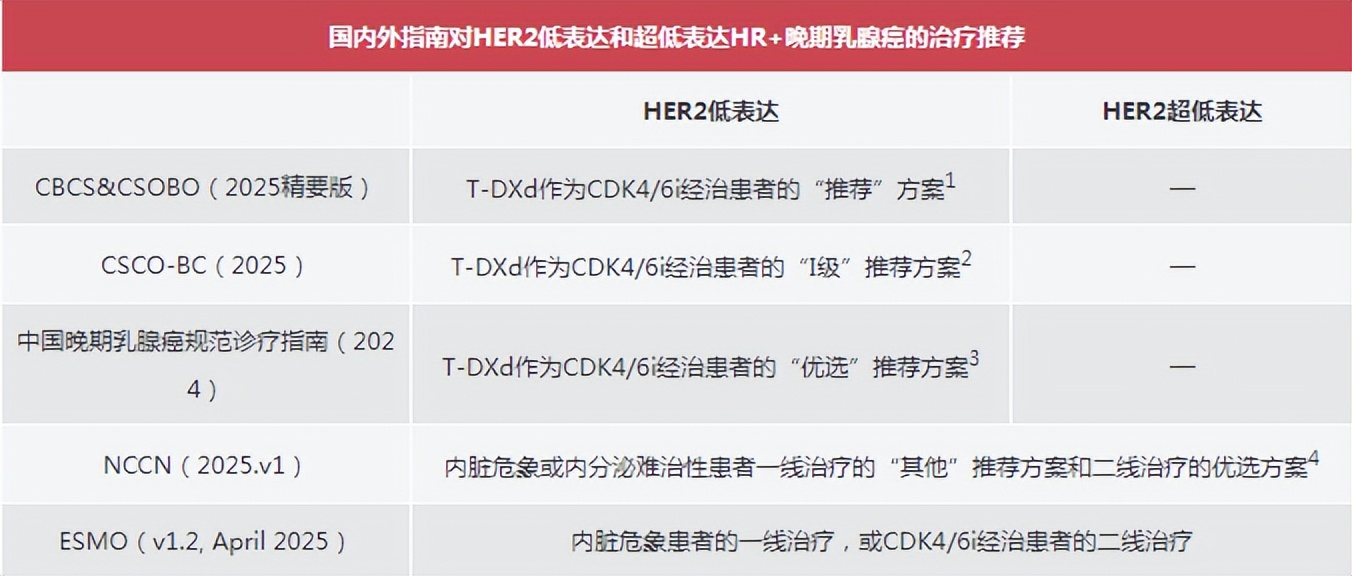 在2025年4月更新的ESMO在线指南中:针对内脏危象的HR+/HER2-晚期乳腺癌患者的T-DXd治疗应用人群,也由既往的HER2低表达扩大至HER2超低表达。