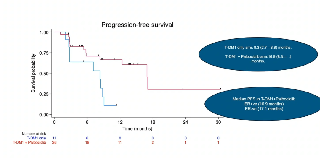 T-DM1单药组和T-DM1+哌柏西利组的中位PFS分别为8.3个月和16.9个月,其中雌激素受体阳性(ER+)亚型(中位PFS:16.9个月)和ER-亚型(中位PFS:17.1个月)的中位PFS相似。T-DM1单药组的ORR和疾病控制率[定义为完全缓解(CR)或部分缓解(PR)或疾病稳定≥6个月]分别为18.2%和63.6%,T-DM1+哌柏西利组的ORR和疾病控制率分别为42.9%和85.7%,联合组CR 3例,PR 12例。联合用药未发现新的不良事件,每种药物的不良事件符合预期。