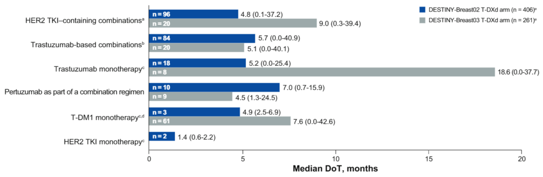 在DB-03研究中,后续治疗包括T-DM1(n=61)、曲妥珠单抗联合治疗(n=20)、HER2 TKI联合治疗(n=20)、帕妥珠单抗联合治疗(n=9)、曲妥珠单抗单药治疗(n=8),其中位DoT分别为7.6、5.1、9.0、4.5、18.6个月。