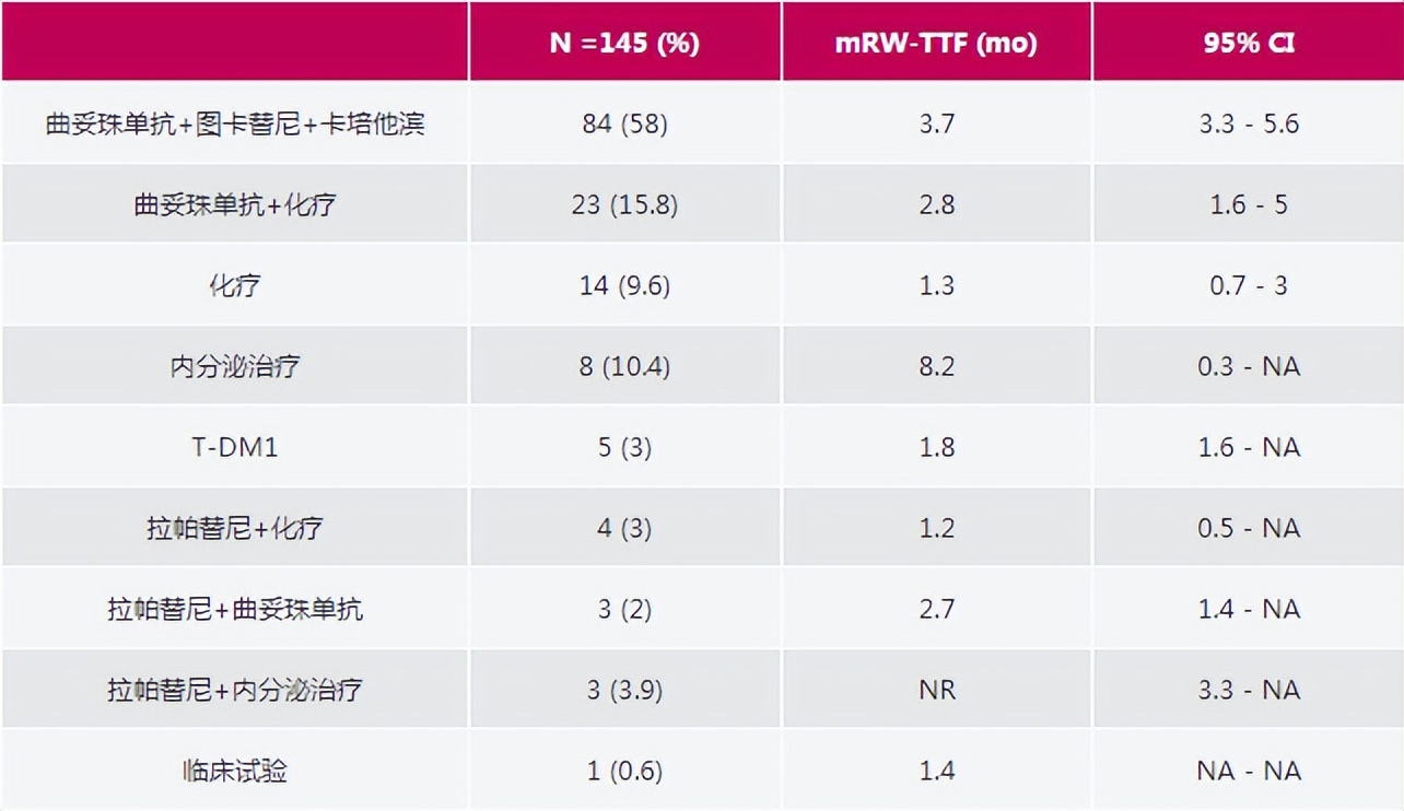最常使用的一线治疗方案是曲妥珠单抗+图卡替尼+卡培他滨(58%)和曲妥珠单抗联合化疗(15.8%),中位至治疗失败时间(TTF)分别为3.7个月2.8个月
