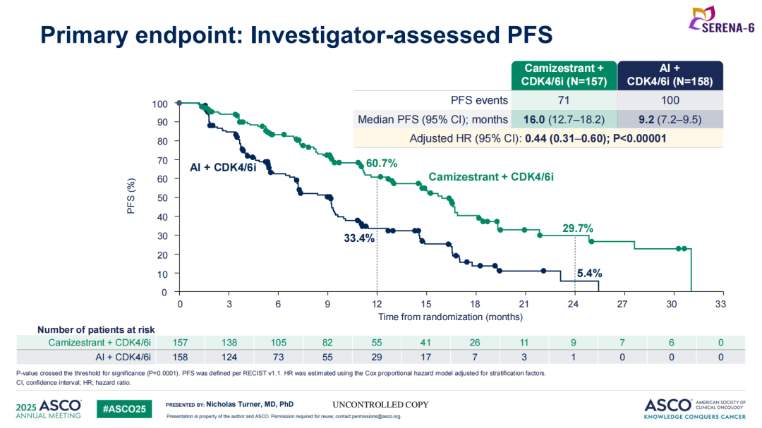 在315例检测到ESR1m且无疾病进展的患者中,按1:1比例随机分配至Camizestrant(75mg)联合持续CDK4/6抑制剂(类型和剂量保持不变)+AI安慰剂治疗组(Camizestrant治疗组;157例患者),或AI+CDK4/6抑制剂+Camizestrant安慰剂组(AI治疗组;158例患者),两组患者基线特征平衡。主要终点为研究者评估的PFS(根据RECIST v1.1标准)。