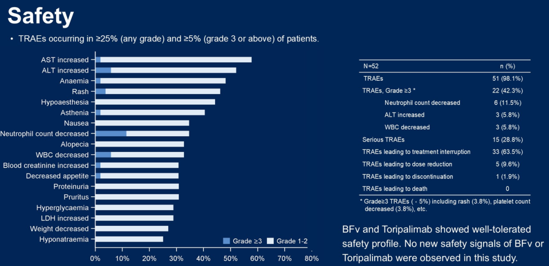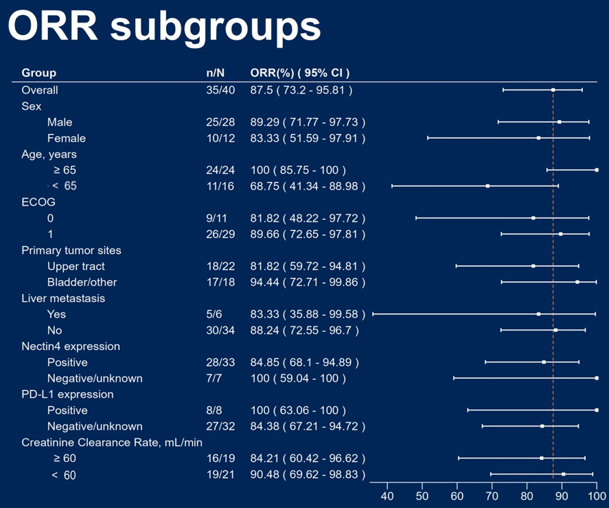 不同亚组中能观察到良好疗效,肝转移患者的ORR为88.2%,膀胱癌患者的ORR为94.4%,Nectin-4阴性表达肿瘤患者的ORR为100%。研究多数治疗相关不良事件(TRAEs)为1-2级,没有发生因TRAEs导致的死亡。