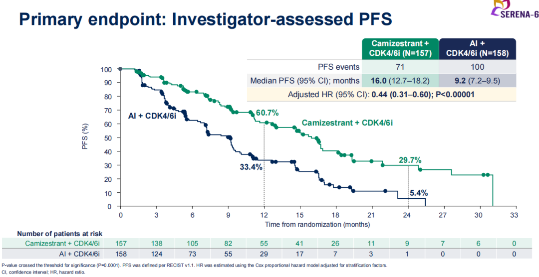 SERENA-4研究是针对既往未接受任何系统治疗的新诊断HR+/HER2-晚期乳腺癌患者的研究。该研究入组人群中,无论患者是否存在ESR1突变,都可以常规应用Camizestrant进行治疗。由此可见,该药物是一种更为强效的内分泌治疗药物。我认为,SERENA-4研究有望取得阳性的结果。