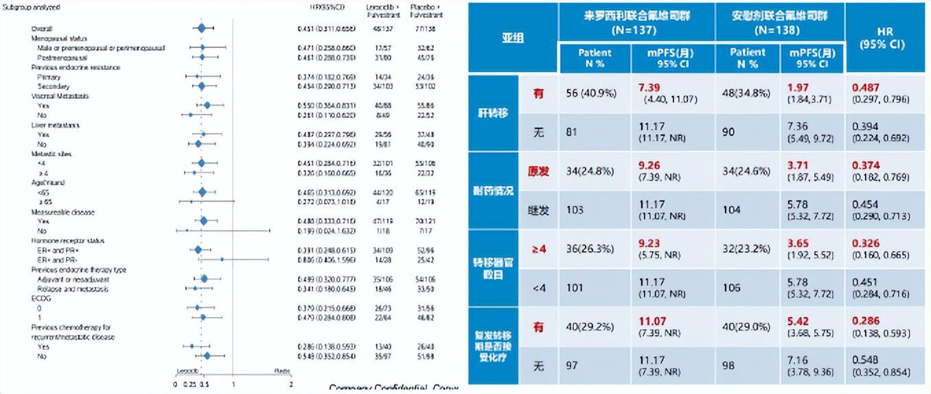 不同亚组均可从来罗西利+氟维司群治疗中获得一致的PFS获益,尤其是肝转移(HR 0.487)、原发耐药(HR 0.374)、高肿瘤负荷(转移器官数目≥4)(HR 0.326)、接受过化疗(HR 0.286)等难治性患者,PFS获益幅度显著。