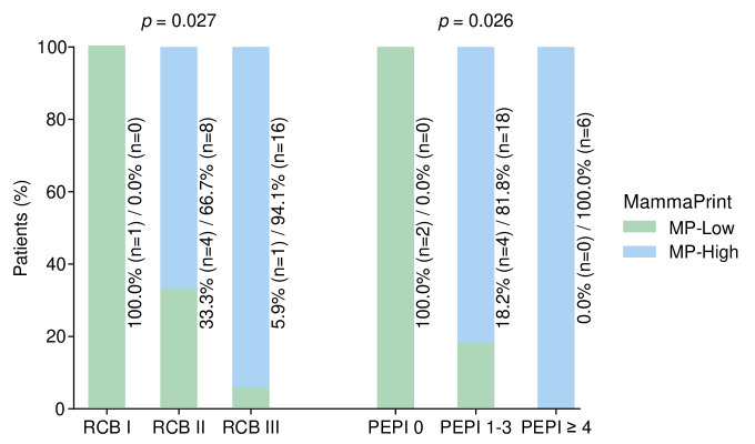 此外,GSTM1在S时显示出显著的拷贝数模式变化,基线时检测到的五个缺失在治疗后不再存在,并出现了五个新的扩增(P=0.007)。早期ctDNA未清除也与RCB III类和PEPI评分≥4显著相关。此外,MammaPrint高风险患者的RCB和PEPI评分显著高于低风险患者。