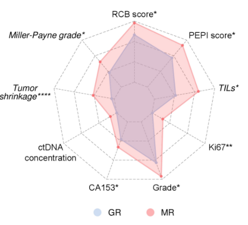 结果显示,GR组和MR组患者的基线临床病理特征平衡。与MRs相比,GRs在S时显示出显著更低的残余肿瘤负荷(RCB)评分、术前内分泌预后指数(PEPI)评分、组织学肿瘤分级、Ki67表达水平和CA153水平。此外,GRs还表现出显著更高的Miller-Payne分级、肿瘤浸润淋巴细胞水平和肿瘤缩小率。