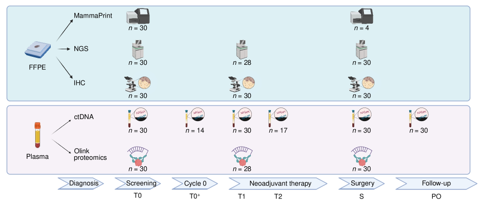 该研究收集了基线(T0)、T1、治疗中期(T2)、手术(S)和术后(PO)的血浆样本,进行了ctDNA和Olink蛋白质组学分析。对T0、T1和S时获取的肿瘤组织进行了体细胞变异分析、免疫组织化学标志物检测和MammaPrint指数评估。根据T1和S时均达到CCCA且S时MRI显示客观反应的患者被归类为良好反应者(GRs,n=15);其他患者为中等反应者(MRs,n=15)。