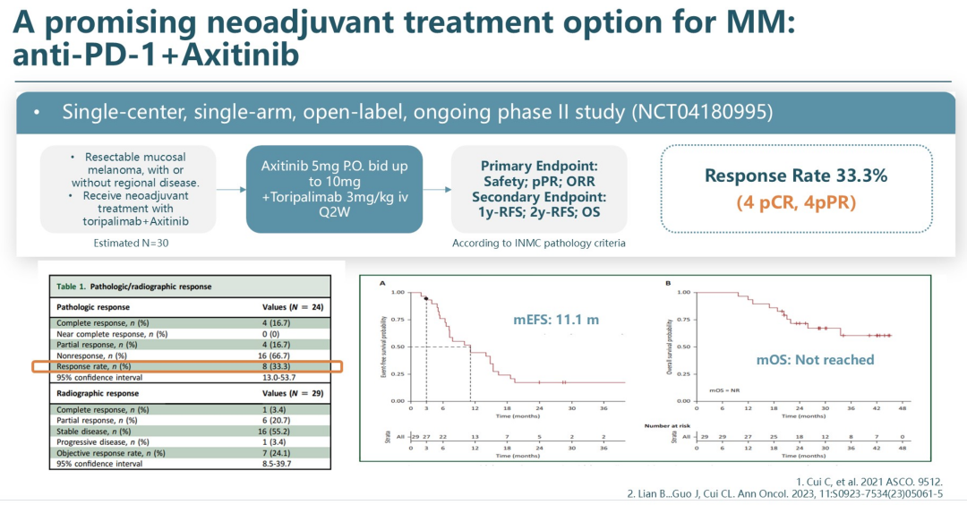 IMNC汇总分析显示,黑色素瘤新辅助治疗达到或接近达到病理完全缓解(pCR)、病理部分缓解(pRP)的患者,1年和2年OS率可达到90%和87%,提示新辅助治疗可能有助于改善患者远期预后。北京大学肿瘤医院团队已报道两项MM新辅助免疫治疗的研究成果。