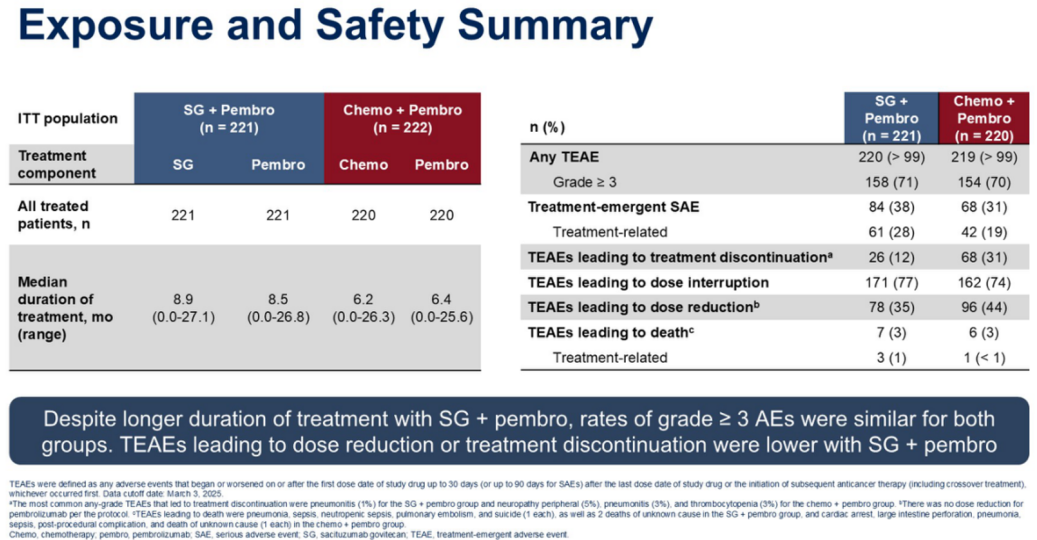 安全性结果与各治疗药物的已知毒性特征一致,且未报告新的安全性信号。整体而言,SG+帕博利珠单抗组相较于化疗+帕博利珠单抗组治疗耐受性好,导致治疗终止的TEAE(12%vs 31%)和导致剂量减少的TEAE(35%vs 44%)发生率均更低。