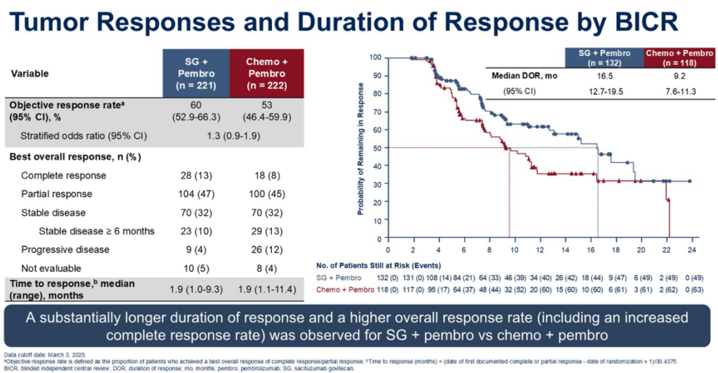 此外,相较于化疗+帕博利珠单抗治疗,SG+帕博利珠单抗组具有更高的ORR(60%vs 53%),并显示出深度且持久的缓解(完全缓解:13%vs 8%;DOR:16.5个月vs 9.2个月)。