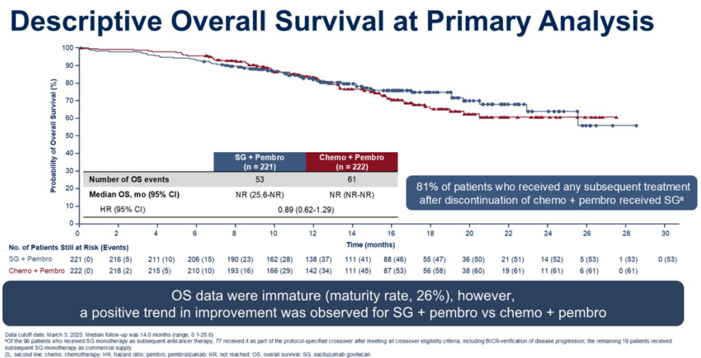 [1]、Sara M.Tolaney,et al.Sacituzumab govitecan(SG)+pembrolizumab(pembro)vs chemotherapy(chemo)+pembro in previously untreated PD-L1–positive advanced triple-negative breast cancer(TNBC):Primary results from the randomized phase 3 ASCENT-04/KEYNOTE-D19 study.2025 ASCO LBA 109