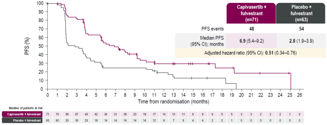 2025年4月18日,卡匹色替在我国获批上市[8],联合氟维司群用于转移性阶段至少接受过一种内分泌治疗后疾病进展,或在辅助治疗期间或完成辅助治疗后12个月内复发的HR+/HER2-且伴有一种或多种PIK3CA/AKT1/PTEN改变的局部晚期或转移性乳腺癌成人患者。