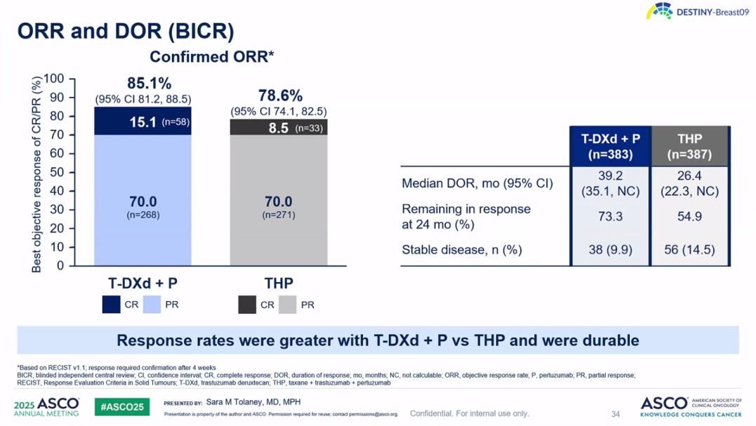 在DESTINY-Breast09研究中,T-DXd+P一线治疗延长患者PFS,超过40个月;同时,T-DXd+P组的PFS2相较于THP组有显著延长(NR vs 36.5个月,HR 0.60,95%CI:0.45~0.79,P=0.00038),显示T-DXd+P一线治疗未能影响后续治疗获益,且OS也展现了获益的趋势。值得关注的是,DB09研究中T-DXd+帕妥珠单抗的客观缓解率(ORR)达到了85.1%,完全缓解(CR)率较THP组提升了一倍,为15.1%vs 8.5%,实现治愈可能性更高。