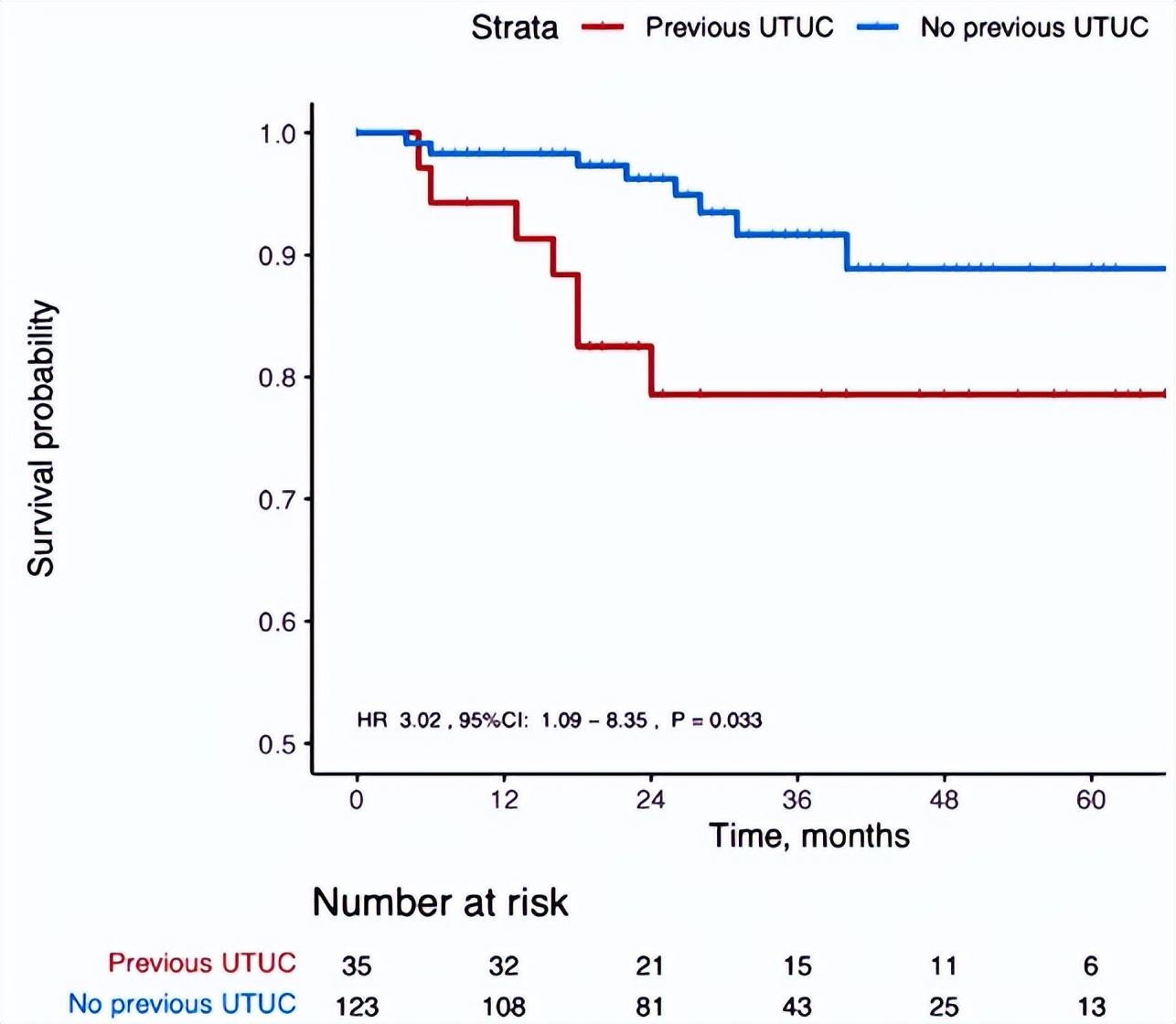 在非匹配分析中,异时性NMIBC与膀胱内高危复发风险增加相关,多变量分析显示,异时性NMIBC亚组复发率为54.3%,而原发NMIBC亚组复发率为28.4%(P=0.012,HR 3.12)。组间复发平均时间相似(异时性NMIBC亚组为11.2个月,原发NMIBC亚组为13.2个月,P=0.548)。除了既往UTUC病史外,多变量分析显示,其他复发高危因素包括EAU风险评分高(P=0.047,HR 2.84)和未能继续维持BCG治疗长达6个月(P=0.009,HR 5.49)。此外,异时性NMIBC亚组中有10例患者(28.6%)最终进展为MIBC,显著高于原发NMIBC亚组,后者仅有7例患者(4.7%)出现疾病进展(P=0.007,HR 4.19)。异时性NMIBC亚组也显示出更高的远处转移进展率(20%vs.6.5%,P=0.017,HR 3.33)。在非倾向匹配分析中,总生存率无显著差异(8.6%vs.18.4%,P=0.248,HR 0.44)。
