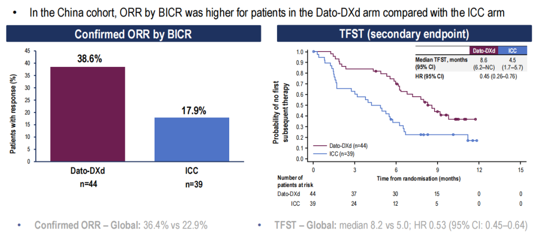 此外,Dato-DXd为中国患者了带来更高缓解率(ORR方面两组分别为38.6%vs17.9%),显著延长至首次后续治疗时间[2]。由此可见,中国人群能够在Dato-DXd的治疗中有更多获益。