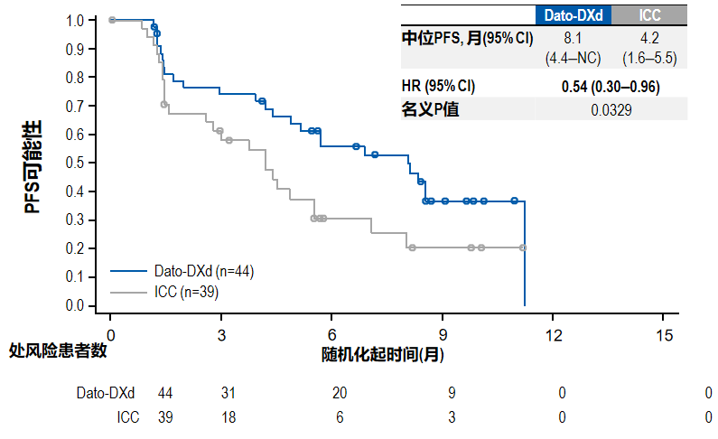 宋国红教授:TB-01研究也有中国中心参研,共纳入了83例(Dato-DXd组44例,化疗组39例)中国患者。王树森教授在2024年ESMO Asia大会上披露了TB-01中国队列的数据显示,BICR评估Dato-DXd组的中位PFS是化疗组的近2倍(8.1 vs 4.2个月),疾病进展或死亡风险则显著降低46%(HR 0.54,95%CI:0.30–0.96,名义P=0.0329)。此外,Dato-DXd组ORR提高了20.7%(38.6%vs 17.9%);至首次后续治疗时间(TFST)也延长了1倍(8.6 vs 4.5个月,HR 0.45,95%CI:0.26–0.76)。