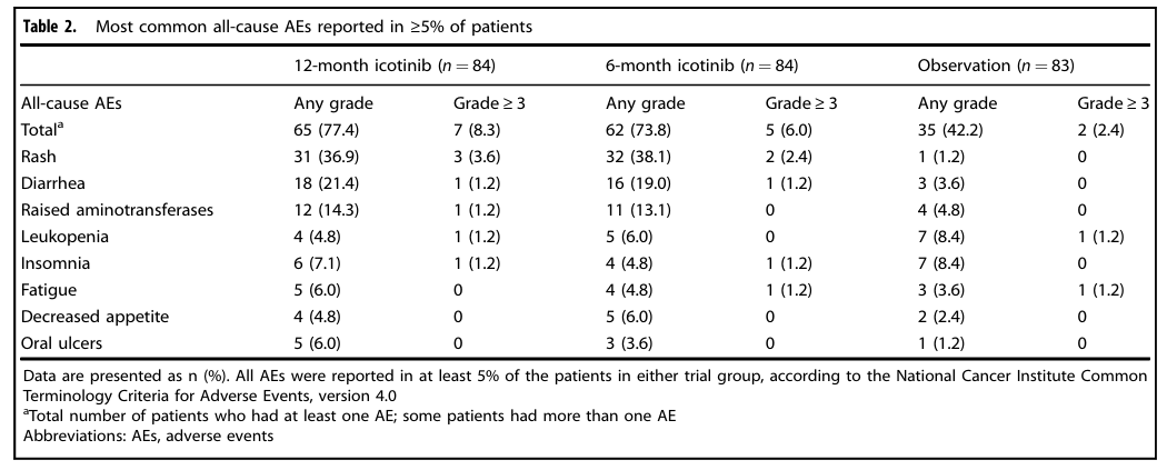 该研究旨在探索埃克替尼(Icotinib)在完全切除的EGFR敏感突变Ⅱ–ⅡIA期非小细胞肺癌(NSCLC)患者术后辅助治疗中的疗效与安全性。该研究创新性地设计了三个组别——12个月埃克替尼治疗组、6个月埃克替尼治疗组以及单纯观察组,所有入组患者均已完成标准辅助化疗。