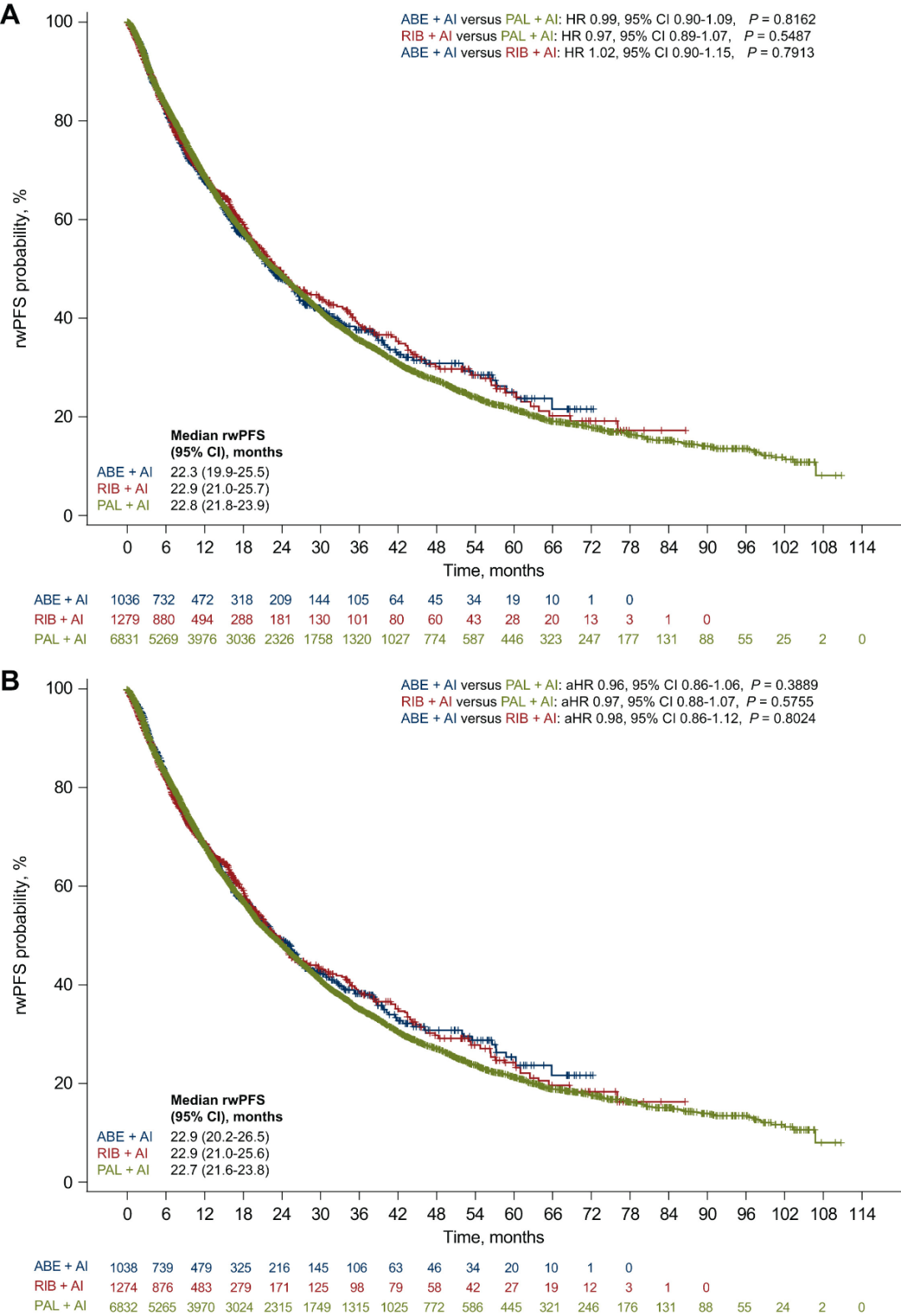 在主要疗效终点rwPFS方面,经sIPTW后哌柏西利+AI组的中位rwPFS为22.7个月,瑞波西利+AI组均为22.9个月,阿贝西利+AI组为22.9个月;其中,瑞波西利+AI组与哌柏西利+AI组相比的HR为0.97(95%CI 0.88–1.07,P=0.5755),阿贝西利+AI组与哌柏西利+AI组相比的HR为0.96(95%CI 0.86–1.06,P=0.3889),阿贝西利+AI组与瑞波西利+AI组相比的HR为0.98(95%CI 0.86–1.12,P=0.8024),表明组间rwPFS均无显著差异(图3)。另外,亚组分析与敏感性分析结果均与总体队列一致,未发现显著组间差异(图4)。