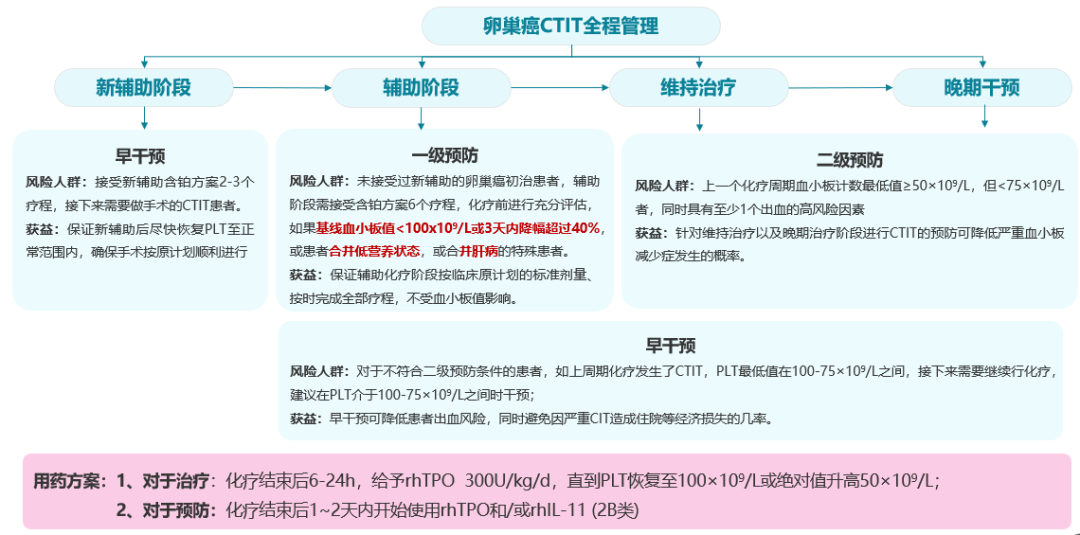 治疗方案含铂类、吉西他滨、PARP抑制剂(如尼拉帕利)等易引发CTIT。发生CTIT的患者因素包括营养状态差、肝功能异常、既往出血史等。对于PARP抑制剂所致CTIT,临床工作者可参考中华医学会妇科肿瘤学分会《卵巢癌PARP抑制剂临床应用指南(2025版)》。