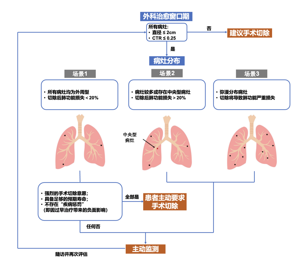 陈海泉教授详细介绍:“第一种情况是当所有病灶均为外周型,切除后肺功能损失<20%时,可选择主动监测,或在不影响人生轨迹和职业生涯的时机,行手术完整切除;第二种情况是当病灶较多或存在中央型病灶,切除后肺功能损失>20%,可优先主动监测,避免大范围手术;第三个情况是,当弥漫分布病灶,切除将导致肺功能严重损失,临床决策首先进行主动监测,选择性处理出现进展病灶,不建议全切。”