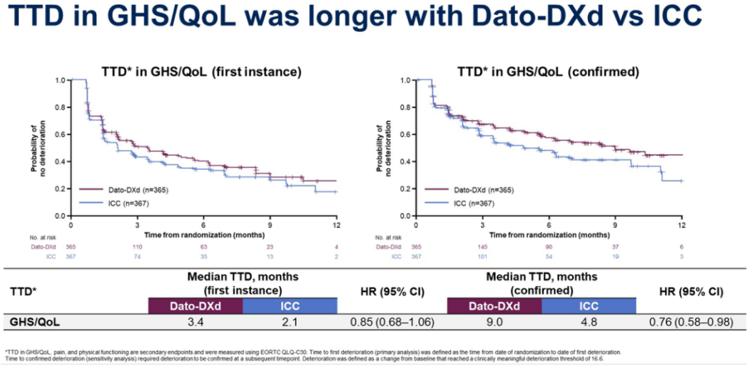 此外,TROPION-Breast01研究QoL结果显示[11],Dato-DXd组相较于化疗组显著延长内分泌经治且接受过1线化疗HR+/HER2-mBC患者GHS/QoL,疼痛和躯体功能至恶化时间(TTD):