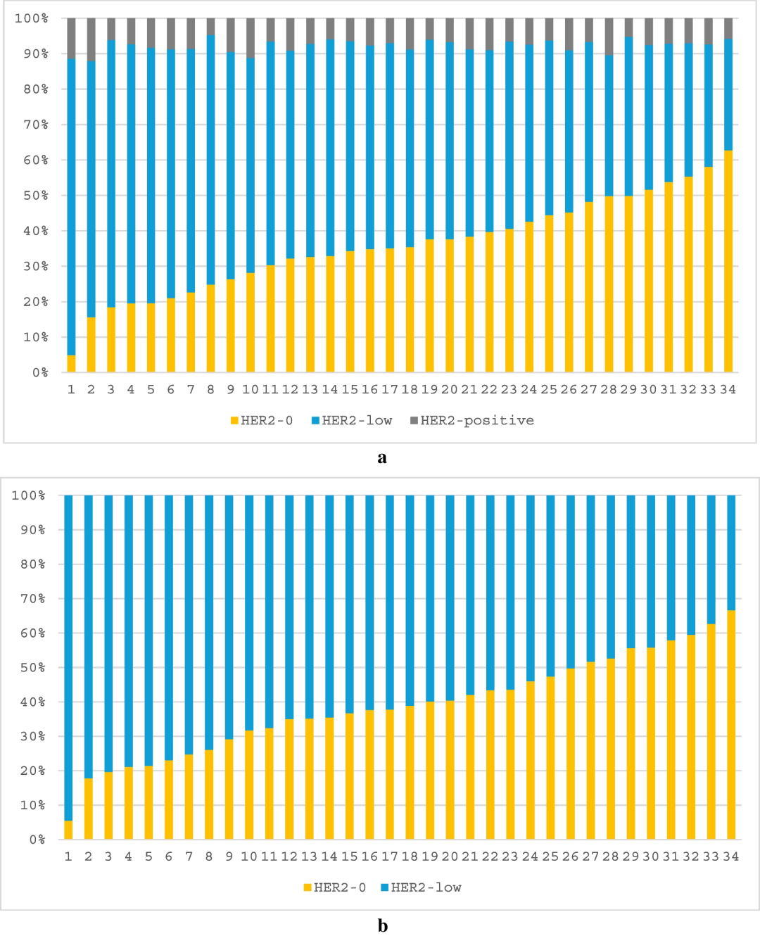 各个实验室的病例总数为635~7075例(中位数为2294例)。HER2低表达的分布在各实验室之间存在差异,百分比范围为31%~83%。在非扩增病例中,HER2低表达的比例为33.4%~94.5%。