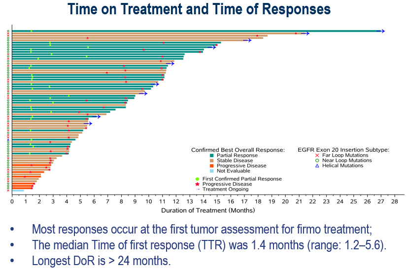 首次缓解时间的中位数约为1.4个月[6],延续了伏美替尼一贯起效快的特点。另外,无论突变位置是近环、远环还是螺旋区,伏美替尼均可产生有效的抗肿瘤反应[6],提示其可能具有广谱的疗效,不受突变位置限制,这对于具有不同ex20ins突变的晚期患者是一个好消息。