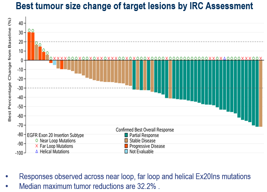 柳影教授:我们知道,EGFR突变是NSCLC中最常见的驱动基因;我国NSCLC患者中的EGFR突变比例约为50%[7]。其中,ex20ins突变是EGFR的第三大突变亚型[6]。这类患者异质性强,预后较差[7]EGFR ex20ins患者从目前的传统化疗、第一代、第二代、其他第三代EGFR酪氨酸激酶抑制剂(TKI)和免疫治疗中的获益有限[2]。目前,EGFR ex20ins患者的治疗仍存在非常大的未被满足的需求[7],包括ORR、PFS、安全性等等不尽如人意,亟需探索新型治疗策略。