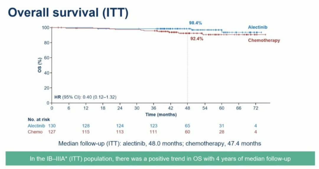 疾病复发风险持续降低,在II-IIIA期和总体ITT人群中风险比分别为0.36和0.35。在II-IIIA期患者中,阿来替尼组的4年无病生存率为74.5%,而化疗组为46.3%;中位无病生存期分别为未达到和41.4个月(HR=0.36)。