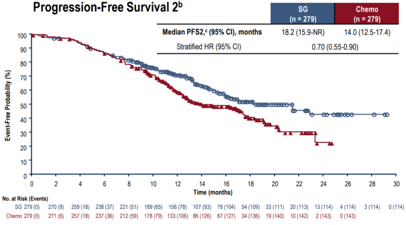在安全性方面,SG组中位治疗时间8.3个月,TPC中位治疗时间约6个月,SG组≥3级常见不良事件为中性粒细胞减少、腹泻,未见新的不良事件信号。SG组耐受性较对照组更好,治疗期间不良事件(TEAE)导致的治疗减量比例为37%vs 45%,TEAE导致的治疗终止比例为4%vs 12%。由此可见,SG可控的安全性和良好的耐受性为患者如期按量接受治疗、争取最大获益奠定了基础。