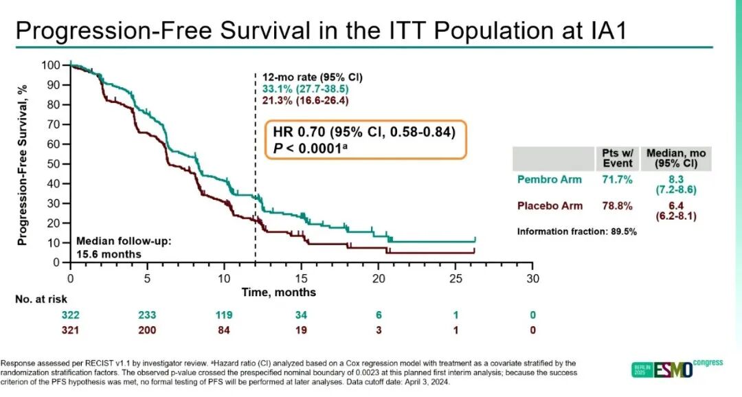 ☆在首次中期分析中,中位随访15.6个月。在非选择意向治疗(ITT)人群中,帕博利珠单抗组的中位PFS为8.3个月,而安慰剂组为6.4个月(风险比<hr/>=0.70;95%置信区间[CI]0.58–0.84;p<0.0001)。在PD-L1阳性肿瘤(PD-L1联合阳性评分[CPS]≥1)患者中,中位PFS分别为8.3个月vs.7.2个月(HR=0.72;95%CI 0.58–0.89;p=0.0014)。