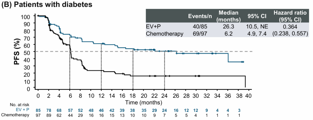探索性分析结果显示[2],对于基线合并糖尿病的患者,维恩妥尤单抗联合方案的中位PFS是化疗组的4.2倍,疾病进展或死亡风险降低64%(26.3个月vs 6.2个月,HR 0.36);中位OS是化疗组的2.5倍,死亡风险降低66%(36.1个月vs 14.5个月,HR 0.34)。维恩妥尤单抗联合方案的的ORR较化疗实现近乎翻倍(69.9%vs 35.4%),中位DOR是化疗的2.8倍(34.2个月vs 12.4个月)。