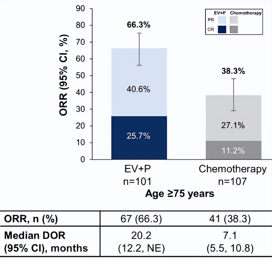 探索性分析结果显示[2],对于老年患者(年龄≥75岁),维恩妥尤单抗联合方案可使中位PFS较化疗实现翻倍,疾病进展或死亡风险降低57%(12.3个月vs 6.0个月,HR 0.43);可使中位OS较化疗翻倍,死亡风险降低49%(24.4个月vs 11.6个月,HR 0.51)。维恩妥尤单抗联合方案可显著改善ORR(66.3%vs 38.3%)和中位DOR(20.2个月vs 7.1个月)。