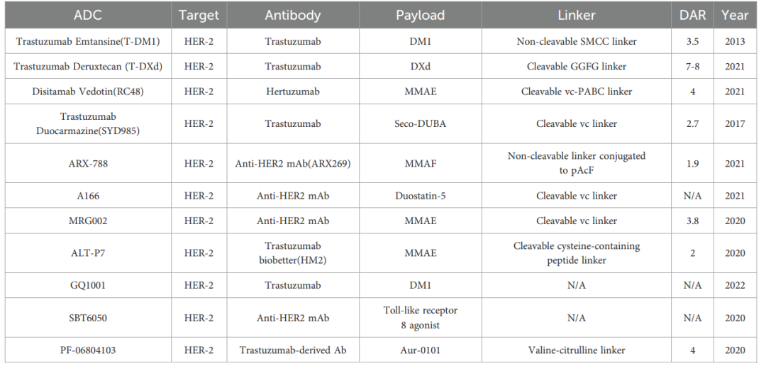 ADC是一类由针对特定抗原的单克隆抗体、小分子细胞毒性药物和化学连接子组成的靶向疗法(表1)。ADC凭借血液循环将其治疗有效载荷精确递送至靶位,发挥双重功能:小分子化疗药物的强效细胞毒性作用和抗体疗法的肿瘤靶向特异性。